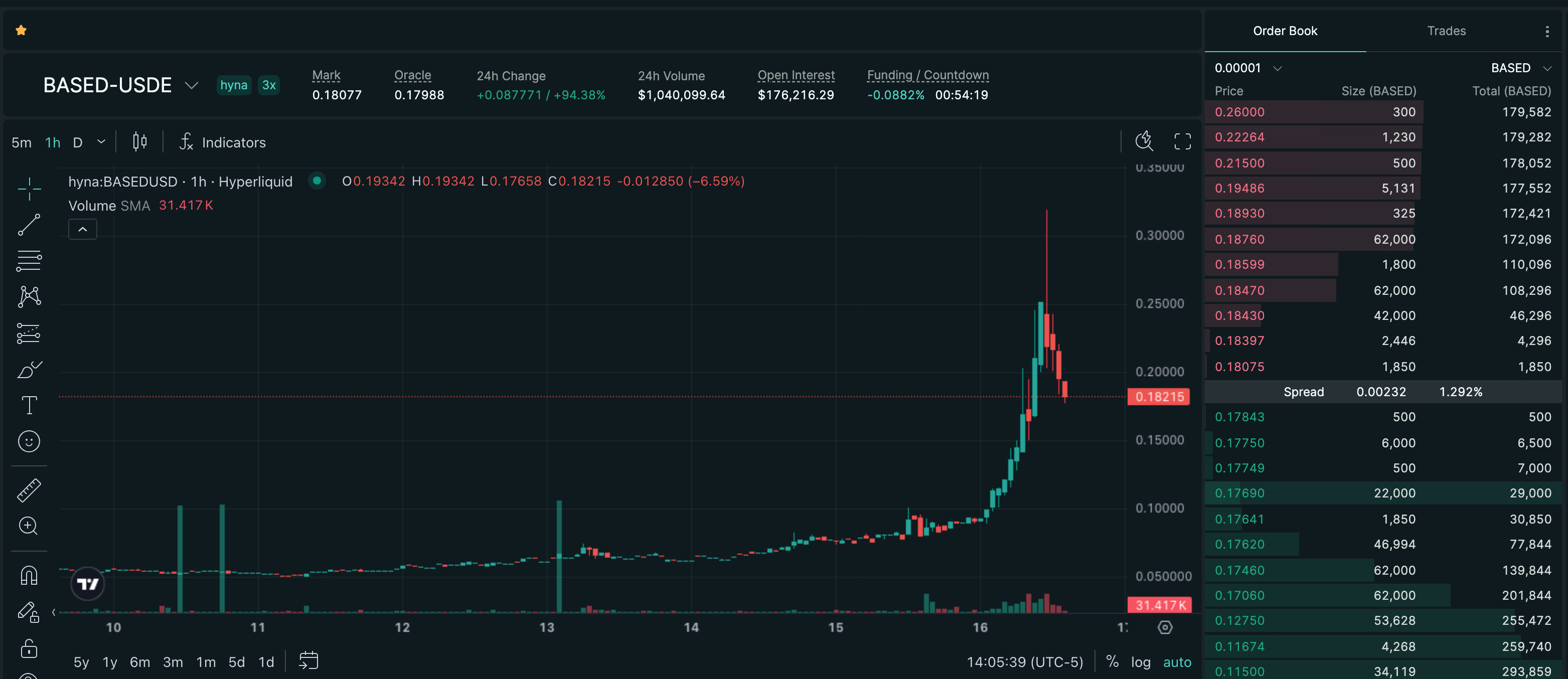 BASED is printing $0.1792 on hyna, up 110.59% over 21 hours and extending an eighth consecutive HIPERWIRE mover session off the April 11 all-time low. The perp has already fractioned off today's $0.1968 high, with HIP3Radar flagging the book this morning for a mark 1.3% below oracle, roughly $265K of open interest, and manipulation risk. Eight sessions in, there is still no token-specific catalyst, a 24-hour perp volume just above $1 million, and a funding curve that keeps rewarding whoever is willing to step in front of the longs.