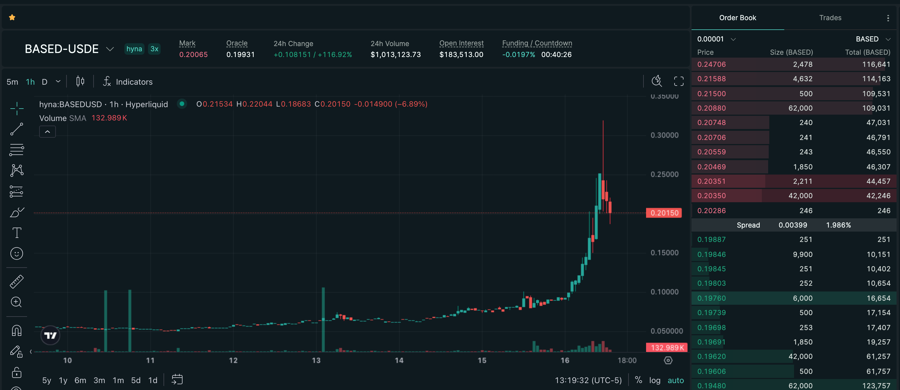BASED is printing $0.1968 on hyna, a 130.70% extension over 20 hours and the seventh consecutive HIPERWIRE mover session for the asset. The perp is still trading at roughly a 3.9x from the April 11 all-time low at $0.05.