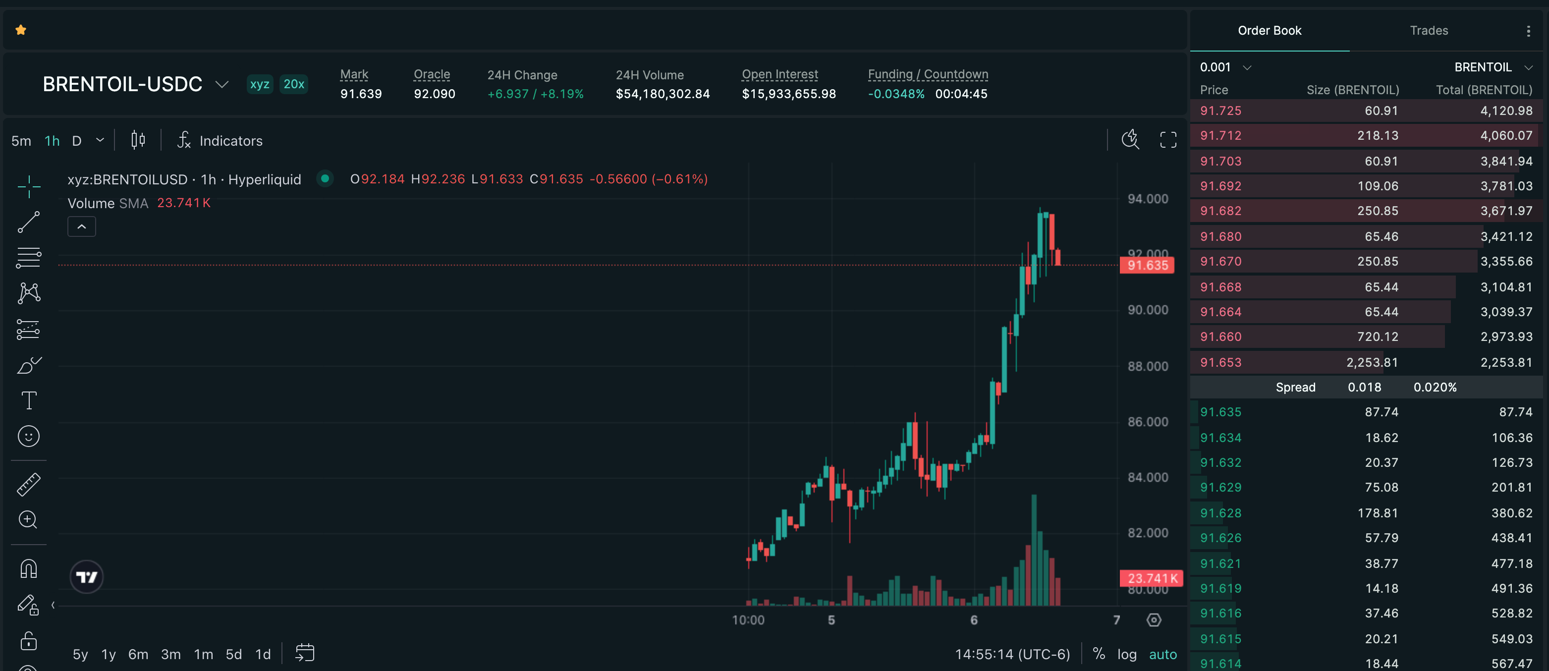 BRENTOIL, Hyperliquid's perp tracking the price of one barrel of Brent crude, surged 9.58% over 20 hours to $91.70 with $54.2 million in 24-hour volume on the HIP-3 market alone. The move mirrors what's happening across traditional oil futures — Brent front-month contracts on ICE settled at $92.69 on March 6, up 8.52% on the session, the highest close since mid-2024.
