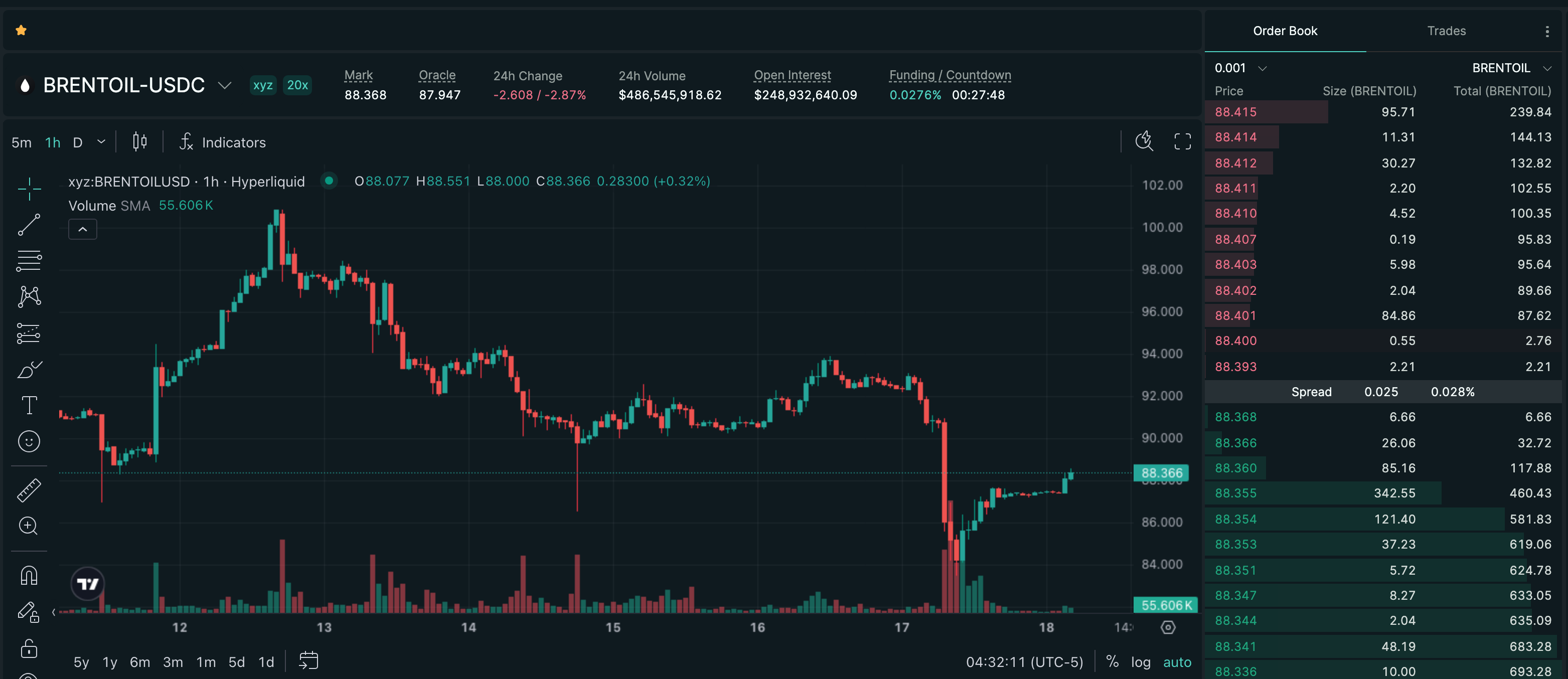 The HIPERWIRE perp at $88.41 sits well below the Brent spot quote near $96, which is a wider basis than the venue normally runs. That gap is the market saying the perp expects either a cleaner reopening confirmation or a deeper unwind of the war premium than spot has caught up to. Today's bounce closes a sliver of that gap rather than chasing spot back toward $100.