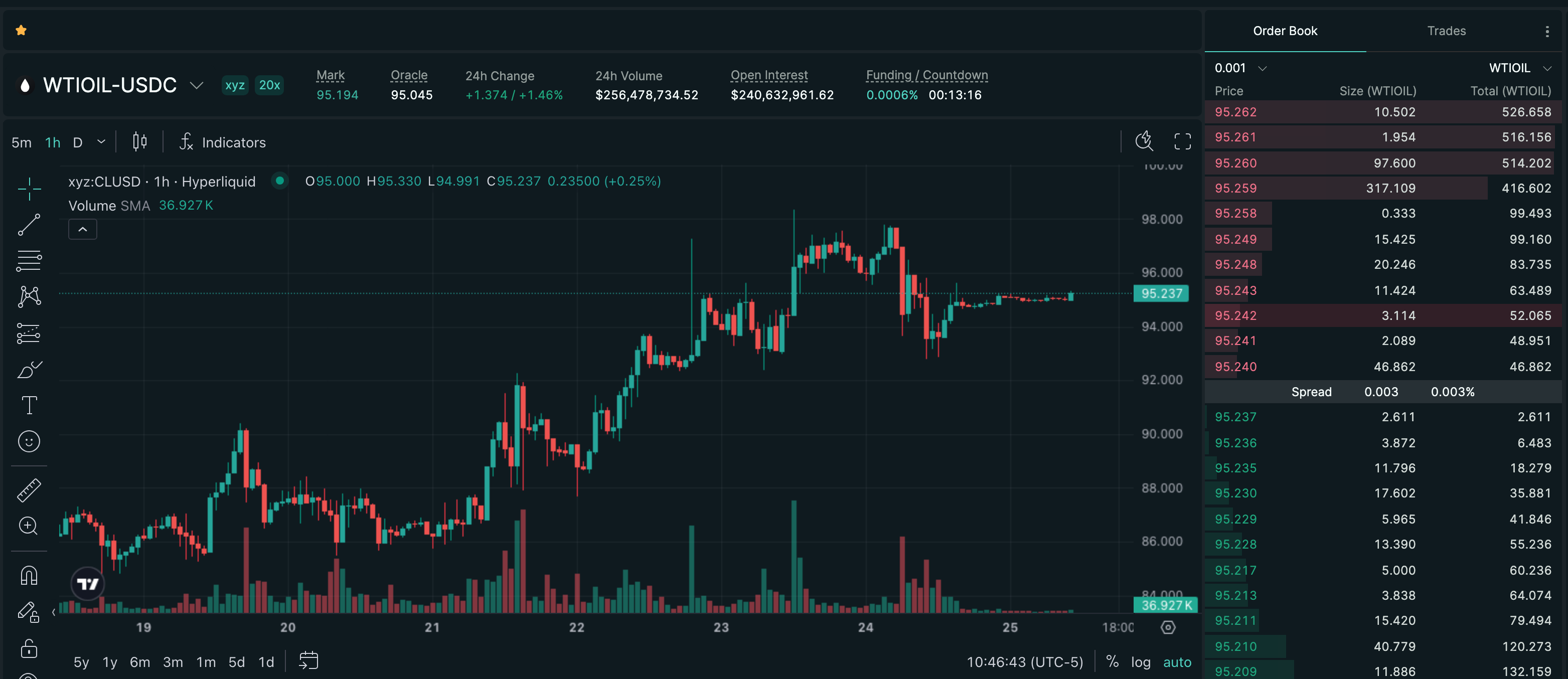 WTI front-month closed at $94.40 on Friday, down 1.51% as the Witkoff-Kushner dispatch hit the tape and traders started pricing the tail of a deal that would unblock Hormuz. That move snapped a four-session winning streak even as the contract still finished up roughly 14% on the week. CL on Hyperliquid traded the same script — our last note had it fading 4% to $93.64 on the diplomatic headline. The 1.81% bid back to $95.26 is that optimism getting marked back down rather than a fresh breakout: Araghchi exiting Pakistan without seeing the Americans is the cleanest possible signal that Friday's risk-off-on-oil trade was early.
