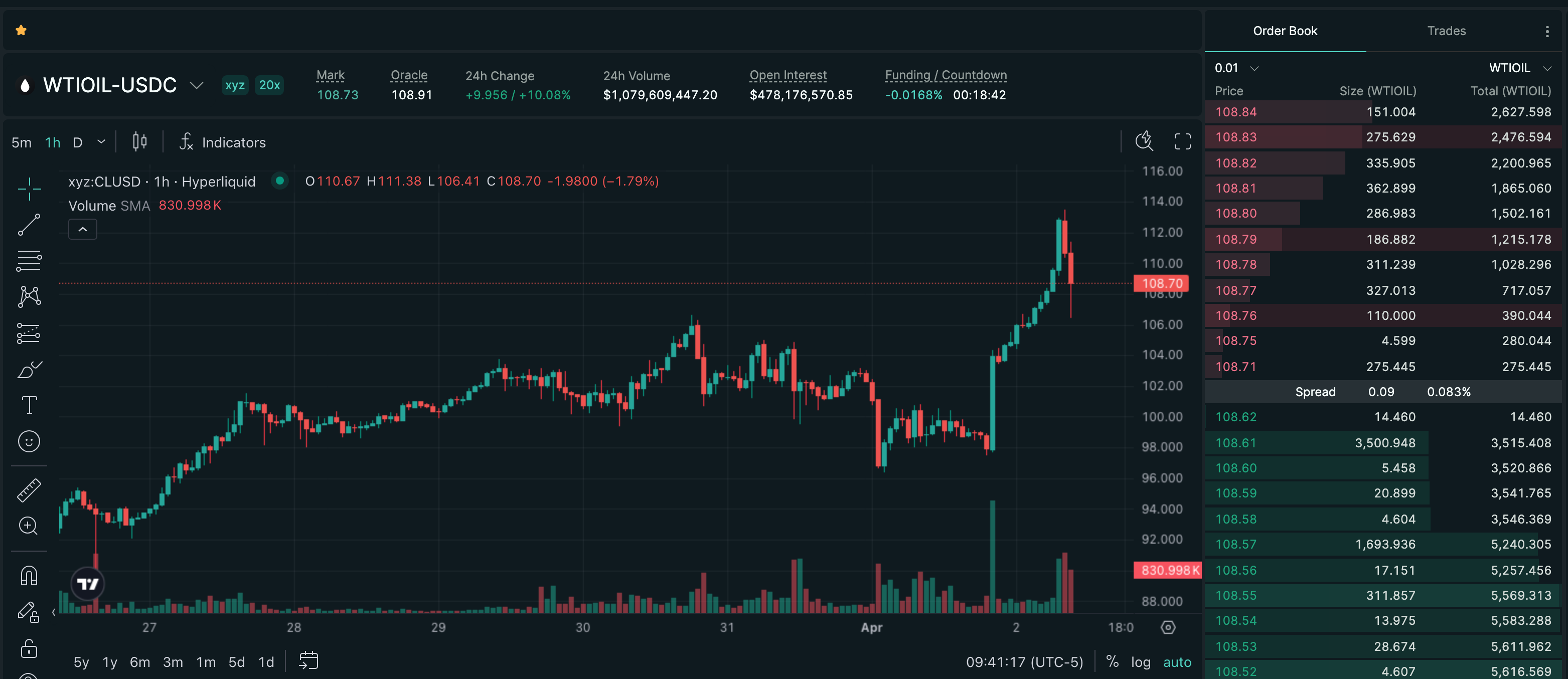 The market reaction was immediate. WTI surged from below $100 to above $108 within hours. Brent crude hit $107.30, up over 6%. The move came on heavy volume, with the Hyperliquid CL perp alone printing over $1 billion in 24-hour volume.