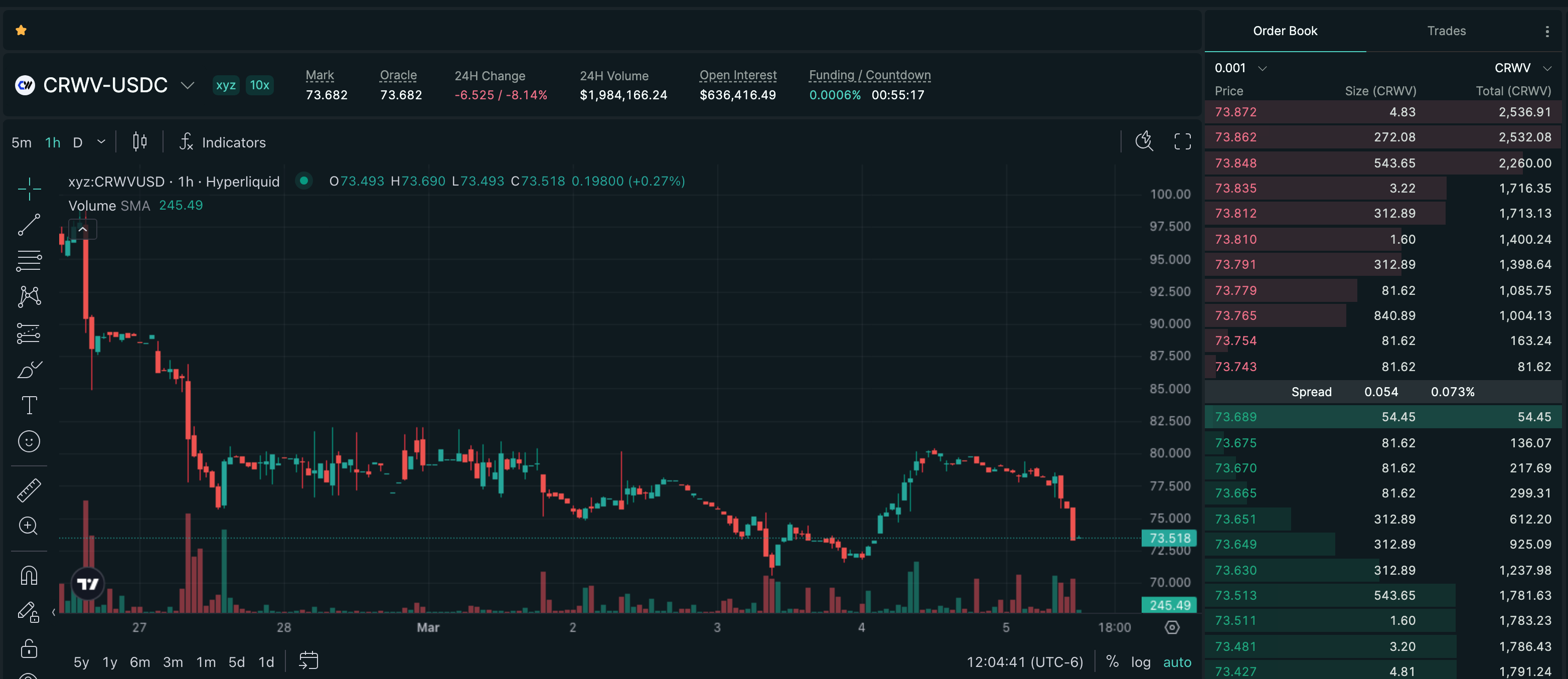 CRWV is available to trade on Hyperliquid with up to 10x leverage.