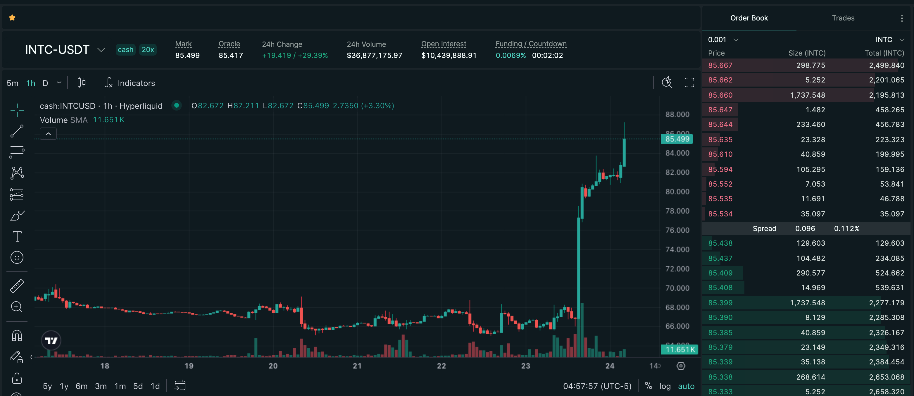 Trade INTC on Hyperliquid with up to 20x leverage.
