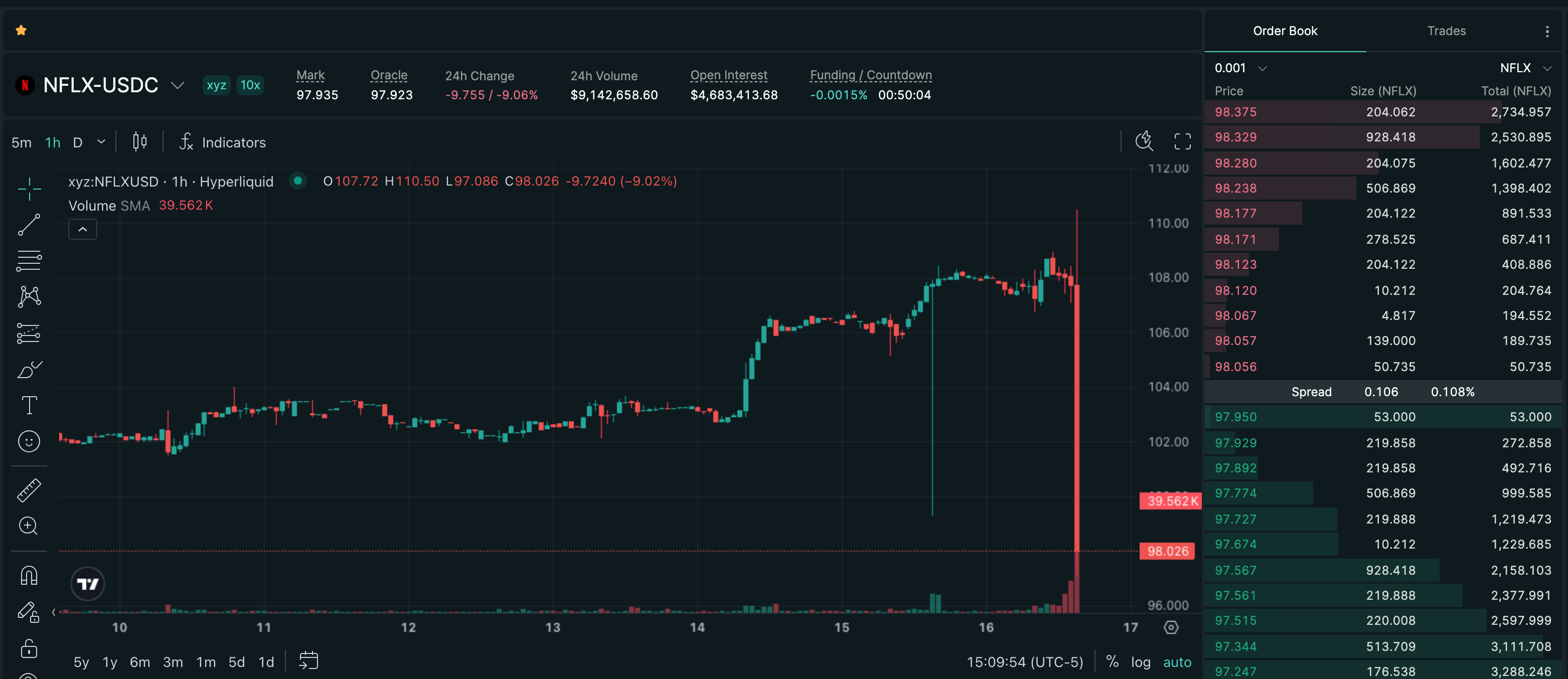 NFLX traded down roughly 10% into the post-market window on the Hyperliquid perp, printing near $97.95 from a pre-close level around $109. Extended trading on the underlying equity hit about $97.45, a 9.67% drop, and the HIP-3 perp tracked it in real time while the NASDAQ session was closed.