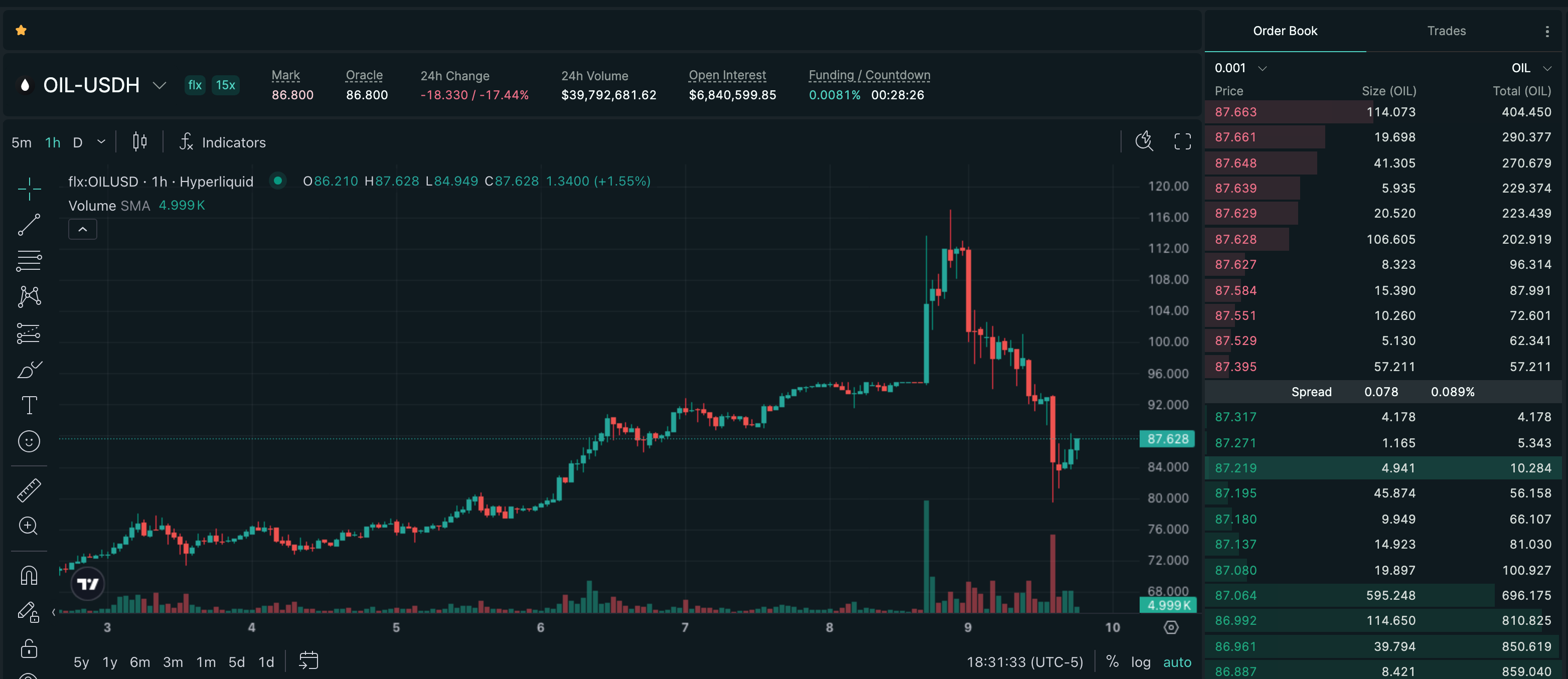 WTI crude crashed from a spike high near $119 to the low $80s in a single session after President Trump told CBS the Iran war is essentially over and floated a US takeover of the Strait of Hormuz. The Hyperliquid OIL perp tracked the unwind, falling 22.76% to $87.35 as traders liquidated the conflict bid that had built up since US-Israeli strikes began on February 28.