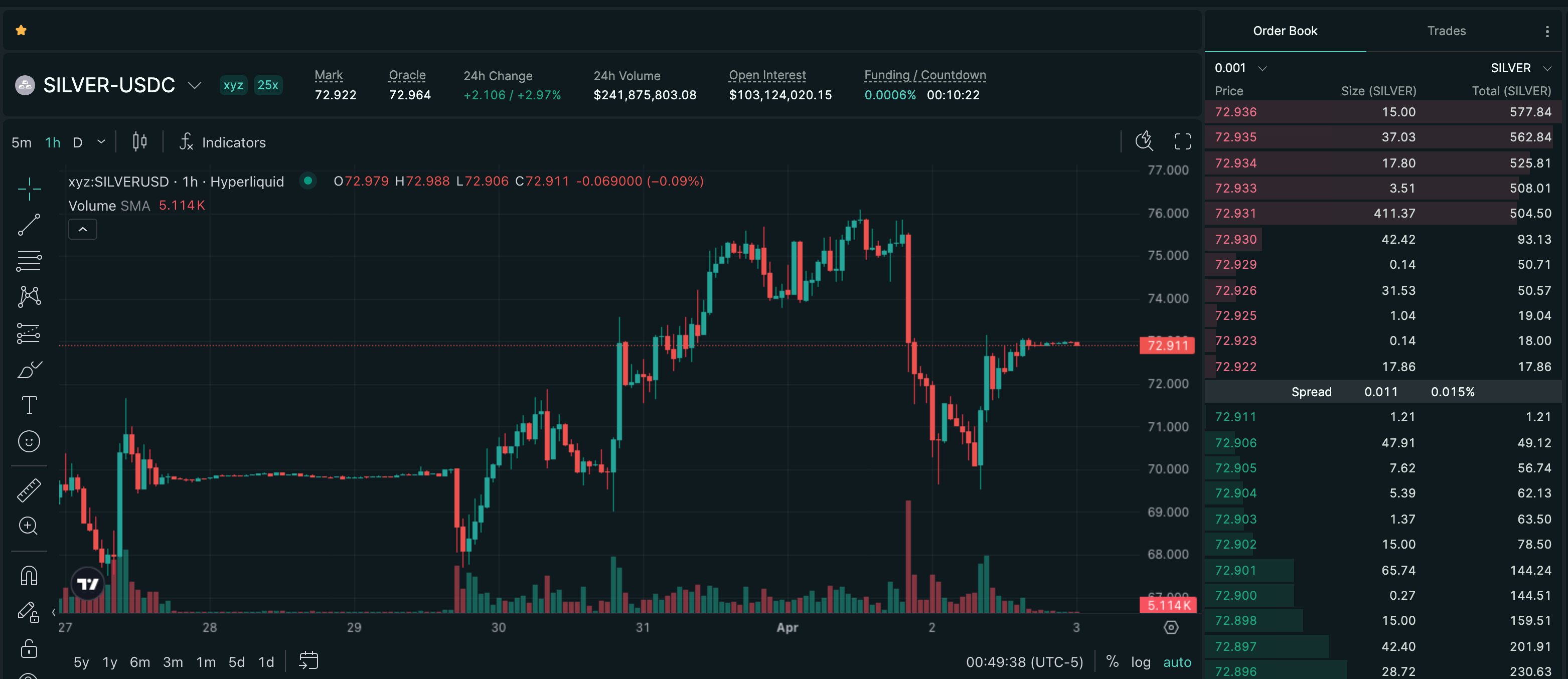 Trade SILVER on Hyperliquid with up to 25x leverage.