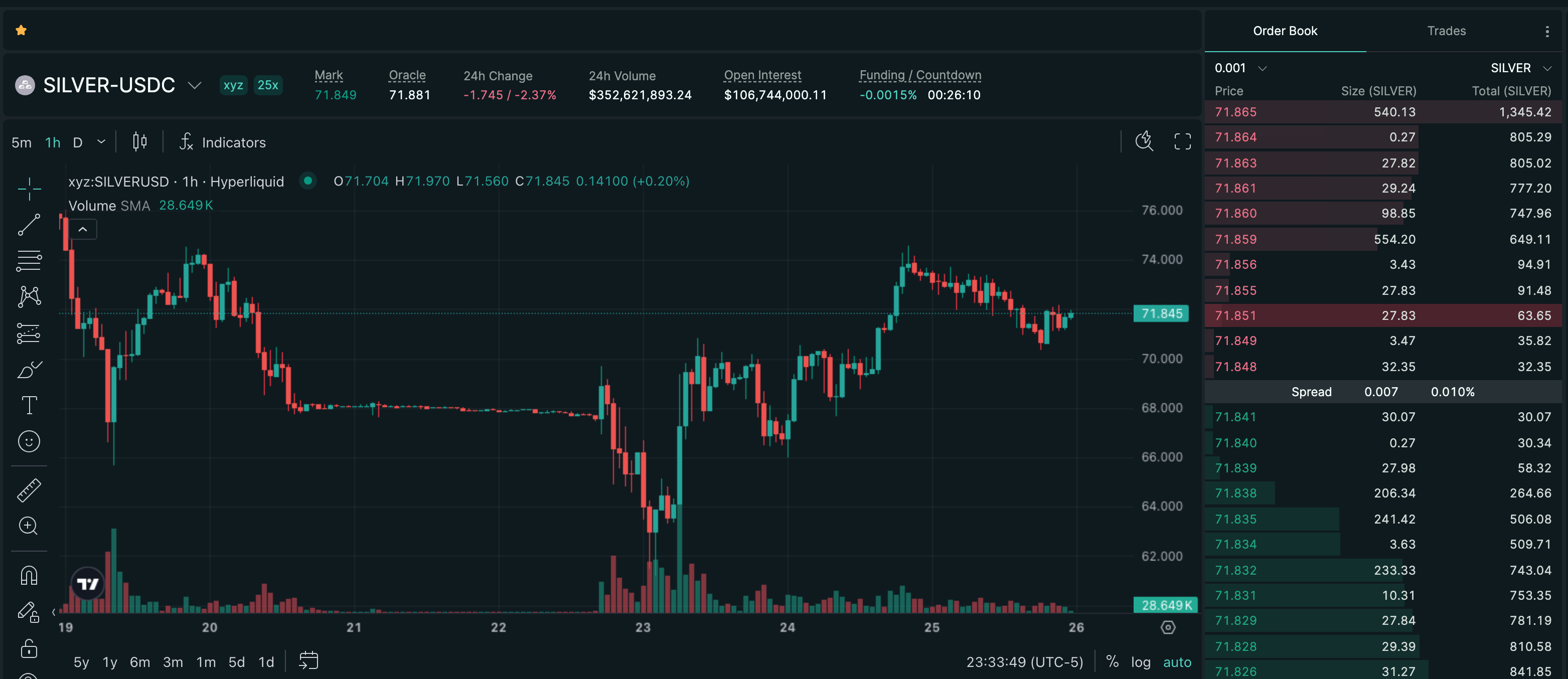 Trade SILVER on Hyperliquid with up to 25x leverage.