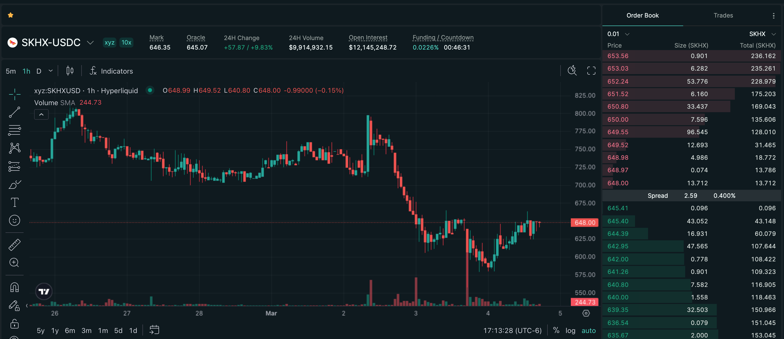 SKHX is available to trade on Hyperliquid with up to 10x leverage, with $9.9M in 24-hour perp volume.