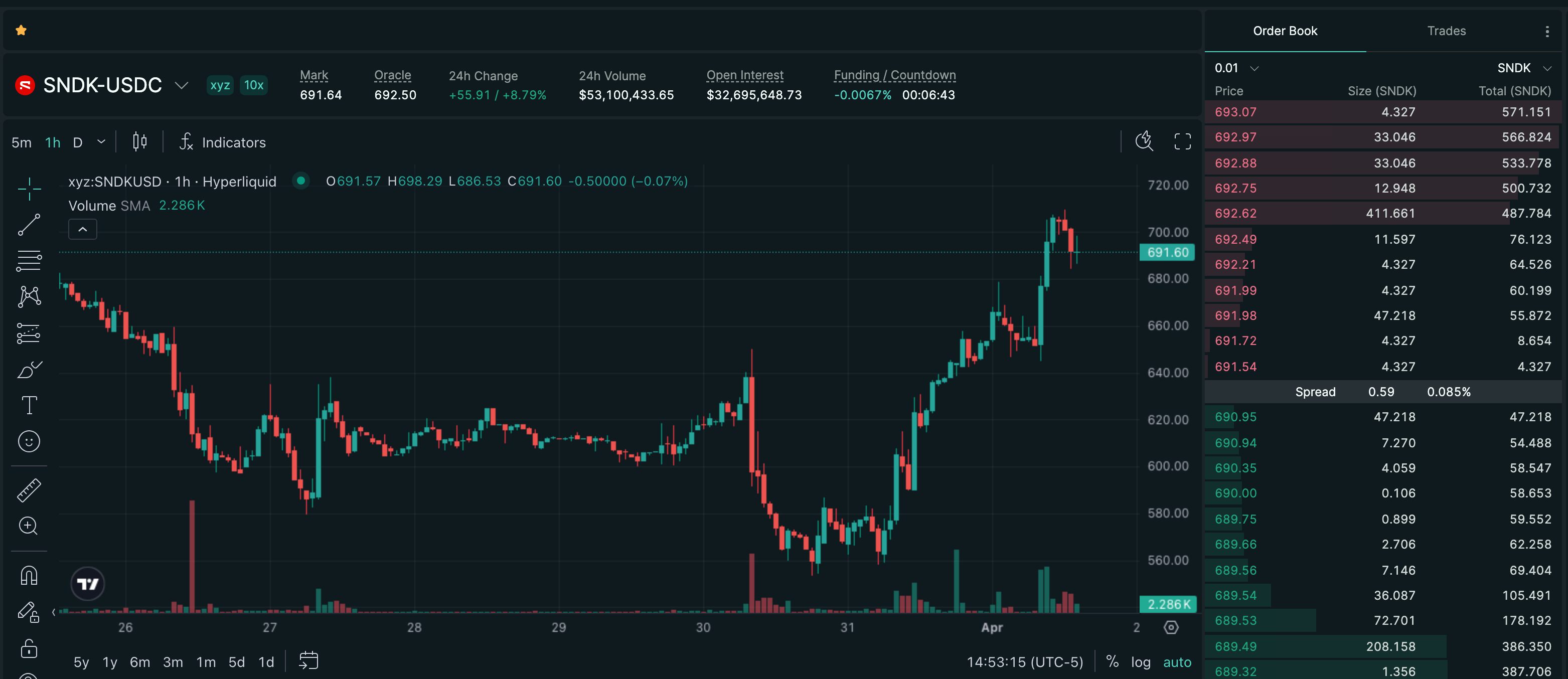 Trade SNDK on Hyperliquid with up to 10x leverage.