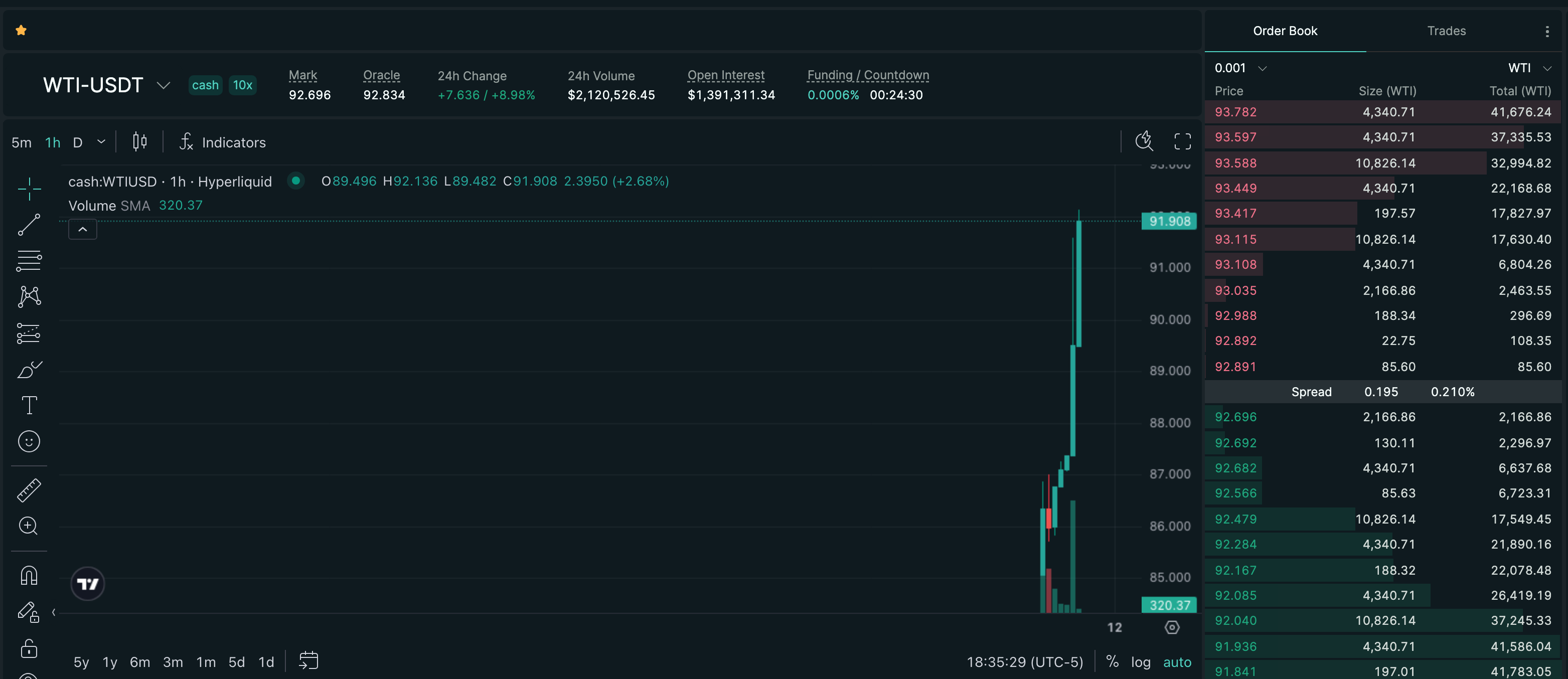On March 11, at least three commercial vessels were hit with projectiles off Iran's coast, and WTI immediately reversed. CME WTI settled up 4.55% at $87.25, while the 24/7 perp market continued climbing to $92.84 — a $5+ premium reflecting overnight risk that traditional markets can't price until the next session open.